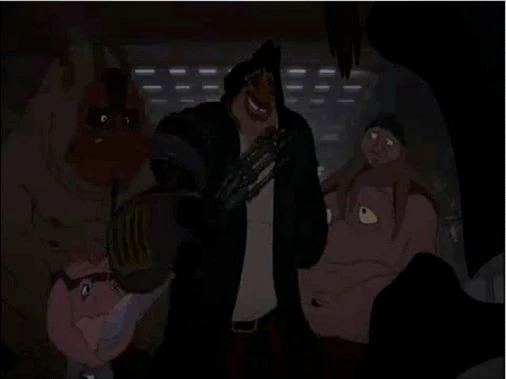 They are first seen aboard the R.L.S. Legacy acting as a sailing crew, hired by Doctor Doppler, but secretly taking orders from John Silver. Jim's suspision of the crew begins to heighten when he eavesdrops on a group of some crew members talking together (presumably about the plan for mutiny). While Jim is swabbing the deck, after his confrontation with Silver's lieutenant, Scroop, it is made clear to the audience that Silver is the real captain of the crew and not simply the ship's cook as he chastised his minions for being too antsy.