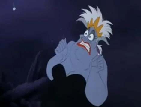 Ursula is a very black-hearted and wicked villain. Aside from this, she has a large sense of humor. Ursula is very manipulative and has a talent for making great sense and making persuasive points when trying to strike a deal. Unlike many Disney Villains, most of whom care very little for their henchmen, Ursula puts Flotsam and Jetsam before everything and everyone else. Ursula treats the eels like children and refers to them as "babies" or "poopsies." When the eels are murdered accidentally by Ursula because of Ariel, she mourns and takes all of her anger and sadness out on Ariel and attempts to crucify her once and for all. She is known to fill the heads of merpeople with deceptions; she feeds Ariel with the lie that men on the surface like quiet in women, when in fact Prince Eric loved Ariel's voice. Despite using contracts to get her way, Ursula has little regard for following her end of the bargain. This is demonstrated when after Triton signed away his freedom for Ariel's safety, Ursula claims she'd have no qualms slaughtering Ariel, despite being implied to have promised to not harm Ariel as a condition of the contract that was signed, and gleefully tries to in the final battle. This is possibly due to Ariel being the cause of Flotsam and Jetsam's deaths. However, for a villain, she expects standards in her home saying to Ariel, "We mustn't lurk in doorways. It's rude."